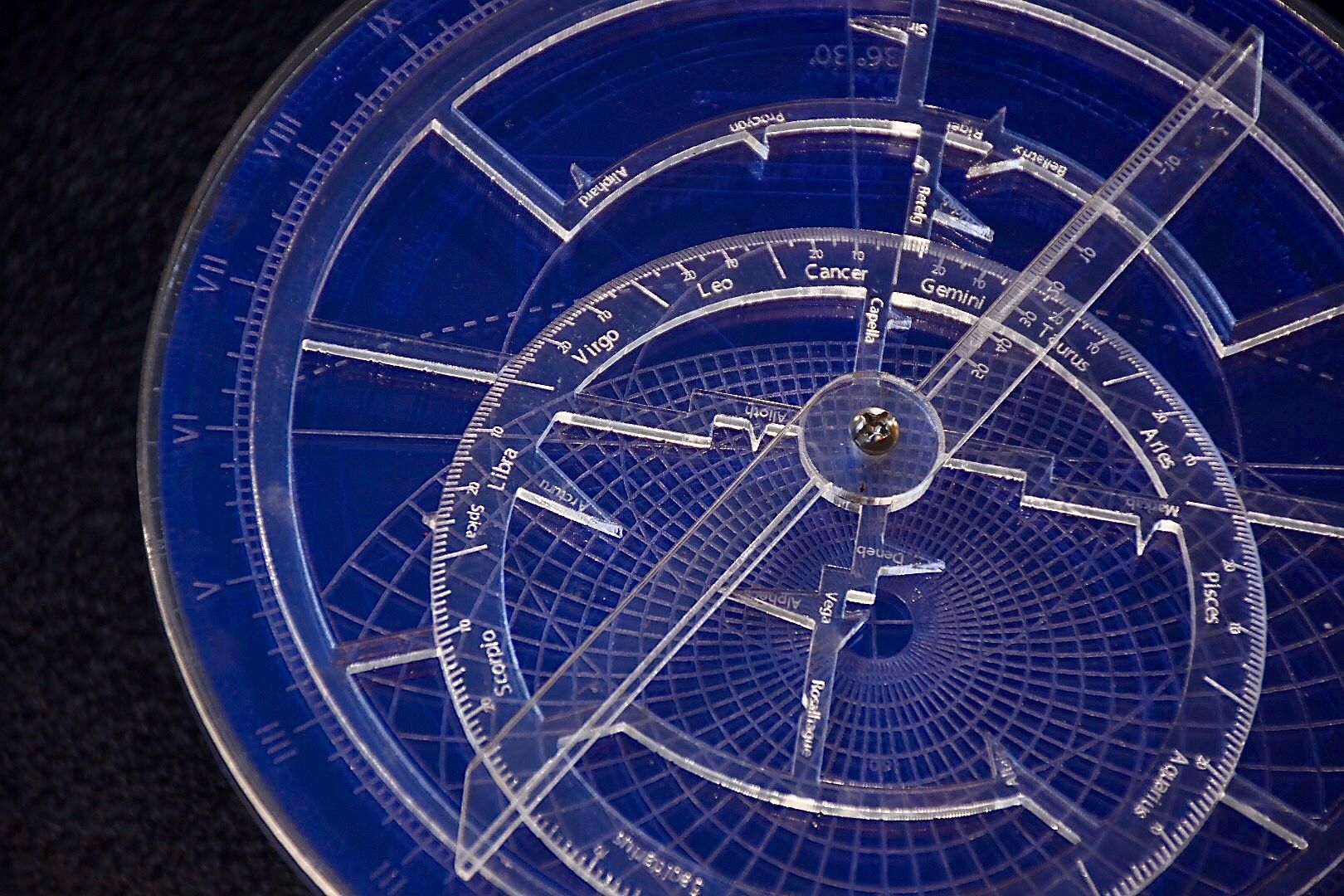 Out a copy of the astrolabe drawing. Make a hole through the centre of all the pieces, in the place indicated by the small circle. Align your astrolabe to the current time and date so you can calculate the position of bright.